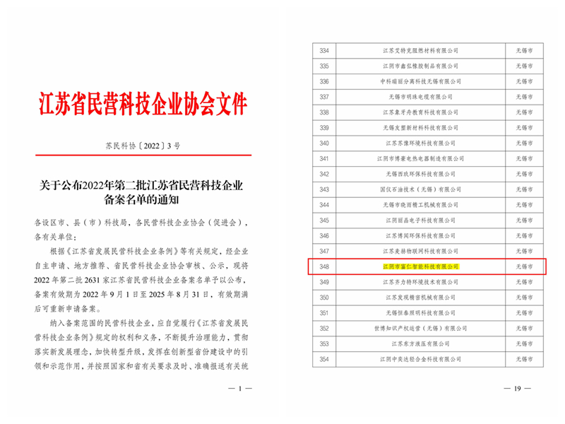 2022年9月1日,根據《江蘇省發(fā)展民營科技企業(yè)條例》等有關規(guī)定,由江蘇省民營科技企業(yè)協會嚴格評審、公示,江陰市富仁智能科技有限公司憑借在智能終端領域的綜合實力和科研創(chuàng)新能力,成功入選備案企業(yè),被認定為“江蘇省民營科技企業(yè)”。