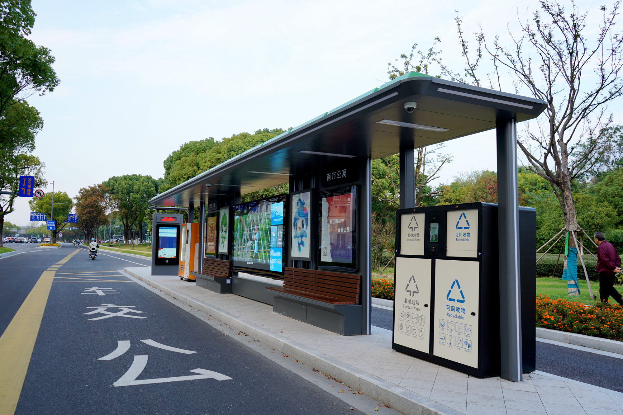 富仁智能垃圾箱以其科技外觀設(shè)計(jì),與公交站臺(tái)相映成輝。設(shè)備配置可回收物和其他垃圾兩個(gè)投口,支持按鈕、掃碼等多種智能投放方式,在滿足垃圾分類的同時(shí),為乘客提供優(yōu)質(zhì)的乘車環(huán)境。