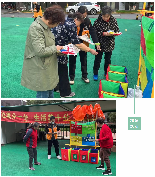 活動以垃圾分類知識宣傳+趣味小游戲的形式開展。首先由工作人員為居民講解生活垃圾為什么要進行分類、生活垃圾怎樣進行分類,以及垃圾分類投放、分類收運處置等內容,增加居民垃圾分類意識。緊接著進入趣味游戲環節,通過投遞垃圾沙包的形式加深對生活垃圾分類的認識,使居民對于各類生活垃圾該如何進行投放有了進一步的認識。